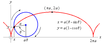 We have solved the brachistochrone problem! Thanks to Caltech2 for notes on some of the less intuitive substitution steps. The above expressions for x and y are a complete description of the optimal path that the rollercoaster must take to get from A to B as quickly as possible using the acceleration of gravity. The only detail we ignored were the integration constants that would be determined in the context of a problem with specific numbers by the exact x and y coordinates of points A and B. The shape of the curve is the same, though; it's merely the offset that changes with these constants. Curiously, the shape described by these equations is equivalent to an upside-down rotation of a section of the path traced out by a point on the edge of a wheel as it rolls along a flat surface, also called a cycloid3 See the picture below from BCIT:4